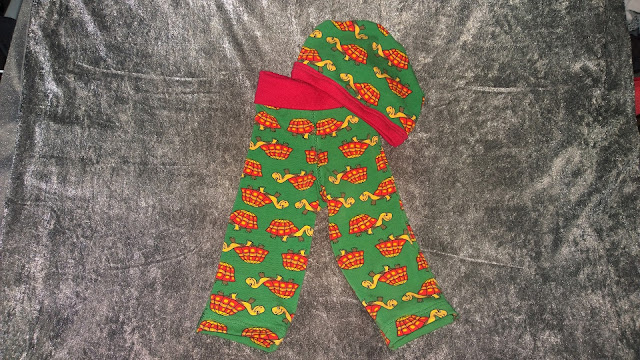 Ensimmäinen vauvan vaatepari, jonka olen ommellut. Olenhan minä ommellut pieniä vaatteita ennenkin, mutta en ihan tätä koko luokaaa. Tai jos olen niin siitä on kyllä niin monta vuotta aikaa, eten muista. Kilppari kankaan joku saattaakin muistaa. Kankaan hommasin silloin loppu vuodesta miehen boksereita varten, muta sitä on edelleen jäljellä ja kangashan oli kangastukulta, samoin kuin punainen resorikin.